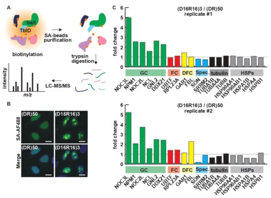 TurboID-mediated proximity labeling was performed as previously described []. Briefly, HeLa cells plated on a 15 cm dish were transfected with TurboID-(DR)50 or TurboID-(D16R16)3. Twenty-four hours after transfection, the cells were incubated with 50 µM biotin for 2 h. After the cells were washed four times with ice-cold PBS, they were lysed using RIPA buffer containing cOmplete protease inhibitor cocktail (Roche). Excess biotin was removed by ultrafiltration using an Amicon Ultra filter. For purifying biotinylated proteins, cell lysates were incubated with Dynabeads MyOne streptavidin beads (Thermo Fisher Scientific) in PBS for 2 h. The beads were sequentially washed with RIPA buffer, 1 M KCl, 0.1 M Na2CO3, 2 M urea in 10 mM Tris-HCl (pH 7.5), and RIPA buffer. The proteins were eluted by boiling with 2× Laemmli sample buffer (Bio-Rad, Hercules, CA, USA) and subjected to quantitative LC–MS []. Briefly, the extracted samples were reduced with 10 mM TCEP at 100 °C for 10 min, alkylated with 50 mM iodoacetamide at room temperature for 45 min, and separated using SDS-PAGE. Protein bands, visualized via Coomassie brilliant blue staining, were excised, destained, and cut finely before in-gel digestion with Trypsin/Lys-C Mix (Promega) at 37°C for 12 h. The digested peptides were analyzed with an Orbitrap Fusion Lumos mass spectrometer (Thermo Fisher Scientific) in combination with an UltiMate 3000 RSLC nano-flow HPLC system (Thermo Fisher Scientific) in the HCD MS/MS mode. Peptides were identified and quantified using Proteome Discoverer 2.4 software (Thermo Fisher Scientific), where the MS/MS spectra were searched against the Homo sapiens protein database in SwissProt (https://www.uniprot.org/, accessed on 6 July 2022), with a false discovery rate of 1% as an identification cutoff.