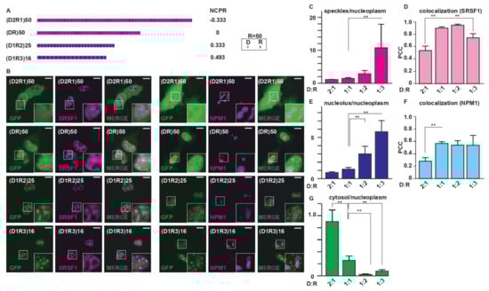 Next, we examined how the net charge of an R-MCD affects its subcellular localization. To this end, we synthesized R-MCD variants containing the same number of R residues (n = 50) with different net charges (Figure 4A). The net charge per residue (NCPR) of these R-MCD variants ranged from −0.333 to 0.493. An increase in the NCPR through R up to +0.2 was shown to enhance the incorporation of (DR)50 mutants into nuclear speckles []. GFP-(D2R1)50 (NPCR = −0.333) showed a diffused distribution pattern and low cohesion with nuclear speckles (Figure 4B). When the proportion of R-MCD changed and the number of acidic amino acids was reduced to impart a net positive charge, the condensation of R-MCDs increased not only in nuclear speckles but also in the nucleolus (Figure 4B–G). This effect was more evident when the net charge increased, which suggests that an increase in the net positive charge of R-MCDs enhances their condensation in MLOs (Figure 4C,E). Note that when the net charge of R-MCDs was negative, their nuclear localization ceased and they diffused into the nucleus and cytoplasm (Figure 4G).