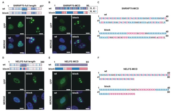 Next, we tested the effect of charge patterning on the R-MCDs of natural nuclear speckle-associated proteins. Wild-type (wt) full lengths of small nuclear ribonucleoprotein U1 subunit 70 (SNRNP70-FL) and wt-SNRNP70-MCD were localized to nuclear speckles (Figure 5A–C). When oppositely charged amino acids were segregated without changing the net charge, the site of localization shifted from the nuclear speckles to the nucleolus. Similarly, the site of localization of the full-length protein and MCD of negative elongation factor complex member E (NELFE) also changed from the nuclear speckles to the nucleolus when the distribution of charged amino acids was changed (Figure 5D–F). These results show that the charge patterning effects observed in the artificial R-MCD are similar to those in natural proteins and are a means of controlling the localization of proteins to MLOs in cells.