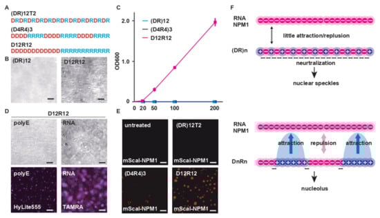 The (DR)12 or D12R12 peptide (1 mM) was dissolved in water and diluted in a phase separation buffer (composed of 10 mM HEPES (PH7.4) and 100 mM NaCl) at 100 µM. The droplets were observed by FV10i confocal microscopy, and the OD600 value was measured using a NanoDrop One (Thermo Fisher). The droplets were mixed with 10 nM TAMRA-labeled rA15 RNA (Fasmac, Kanagawa, Japan) or 10 ng/µL of HyLite555-labeled polyE peptide []. For phase separation with mScarlet-I-NPM1, 1 µM mScarlet-I-NPM1 was mixed with each (DR)12 variant peptide (10 µM) in the phase separation buffer.