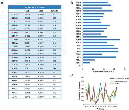 JMJC-KDMs are intrinsically disordered proteins. (A) Table representing the IDR prediction score of JMJC-KDMs using PONDR-VL3, VSL2, and IUPred3 algorithms. (B) Disorder percentage prediction of human JMJC-KDMs using PONDR-VSL3 algorithm (length of disordered segments > 50 amino acids). (C) Amino acid composition of the IDR conserved tracks between KDM families, and disordered proteins. The ordered protein PSMA4 was also included as a negative control (see Methods).