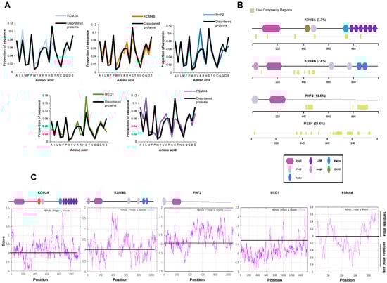 Moreover, disordered regions frequently concur with low-complexity domains that contribute to phase separation [,,,]. Then, we check whether the KDMs are enriched in low-complexity domains using the SEG algorithm (see Material and Methods). As shown in Figure 3B, between 2.6% (KDM4B) and 13.5% (PHF2) of KDM sequences were predicted to contain low-complexity segments. Furthermore, it has been previously described that hydrophobic interactions might be crucial for biomolecular condensate formation [,]. Then, we analyze the hydrophobicity of the selected JMJC-KDMs, finding the presence of hydrophobic tracks (Figure 3C). Thus, our data suggest that the amino acid composition of JMJC-KDMs primes them to be involved in the phase separation process.