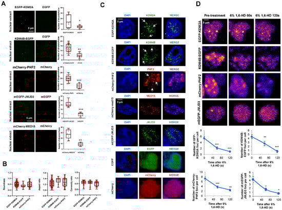 Considering the potential of the analyzed KDMs to phase separate and their role in transcriptional control, we further proceeded to study the capacity of these proteins to form biomolecular condensates. We fused KDM2A and KDM4B to EGFP, and PHF2 to mCherry fluorescence tags (Figure S2A), we expressed them in HEK293T cells (Figure S2B), and we performed in vitro droplet assays using nuclear extracts. Our data show that the selected KDMs formed droplets that do not appear when we overexpressed EGFP or mCherry alone, used as negative controls, suggesting that the droplets can be attributed to KDM proteins and not to the fluorescence tags (Figure 4A). The number of droplets was similar to those obtained for MED15 and Jumonji domain-containing protein 3 (JMJD3), two proteins that experience liquid-liquid phase separation (LLPS) [,], used as positive controls. Furthermore, the obtained droplets showed features [roundness, convexity, and aspect ratio] characteristic of a liquid-like nature (Figure 4B).