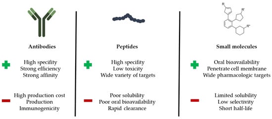Comparison between antibodies, peptides and small molecules with main advantages and disadvantages as PPI modulators.