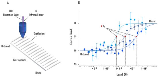 The technique is extremely sensitive to any change in molecular properties, allowing precise analysis of binding events within a few microliters of solution for almost any molecule, such as protein-binding small molecules or ligands binding to liposomes or enzyme substrates. Since MST is a solution-based method, it avoids surface artifacts and immobilization protocols. MST is not restricted by the molecular weight ratio of partners involved in the binding like DLS and does not require a size change like SPR [46]. Besides the phenomenon of thermophoresis, the shape of the MST response is also influenced by the temperature-related intensity change (TRIC) [46]. TRIC is detected just after the IR laser is turned on, whereas thermophoresis is most noticeable at the later stage of signal collection. MST relies on the two effects, which are closely linked together [47]. An illustration of the technology is presented in Figure 2.