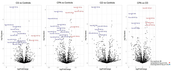For validation by QPCR, the most significant differentially expressed miRNAs (log2 FC > 1.25 & p < 0.005) among the groups were chosen (Table S1). According to the current knowledge, upregulated miRNAs are known to contribute more to pathology than downregulated miRNAs [16]. Since the total number of significantly upregulated miRNAs was six, all these miRNAs were chosen for validation. Contrarily, 25 miRNAs were significantly downregulated among the groups. In particular, miR-486-5p, miR-551b-3p, miR-144-5p, miR-144-3p, and miR-363-3p were found to be commonly downregulated in the CS group in comparison to controls; therefore, these miRNAs were chosen for validation.