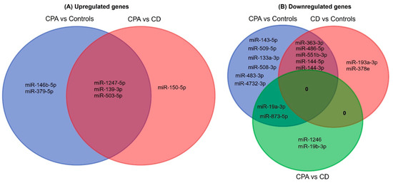 NGS revealed differentially expressed miRNAs between the different groups analyzed (Figure 1). CD and CPA taken together as CS showed a differentially expressed profile (42 significant miRNAs) in comparison to controls. Moreover, individually, CPA and CD were found to show a significantly different expression profile in comparison to controls (n = 38 and n = 17 miRNAs, respectively). Interestingly, there were no significantly upregulated genes in the adrenals of patients with CD in comparison to the control adrenals. A comparative analysis of the top significant miRNAs (log2 fold change (log2 FC) > 1.25 & p < 0.005) between the two groups was performed and the representative Venn diagrams are given in Figure 2. Briefly, miR-1247-5p, miR-139-3p, and miR-503-5p were significantly upregulated in CPA, in comparison to both CD and controls. Furthermore, miR-150-5p was specifically upregulated in CPA as compared to CD. Several miRNAs (miR-486-5p, miR-551b-3p, miR-144-5p, miR-144-3p, and miR-363-3p) were found to be significantly downregulated in the groups of CPA and CD in comparison to controls. MiR-19a-3p and miR-873-5p were found to be commonly downregulated in CPA in comparison to both CD and controls. Principal component analyses based on miRNA sequencing did not identify any major clusters among the samples. Furthermore, the miRNA profile was not different among the CPA samples based on the mutation status of PRKACA (Supplementary Materials Figure S1).