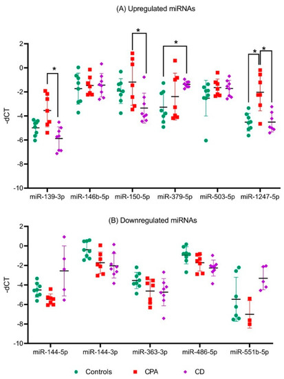 QPCR analyses of significant miRNAs from sequencing analyses. Data are represented as mean ± standard deviation (SD) of −dCT values: (A) Expression analysis of significantly upregulated miRNAs; (B) Expression analysis of common significantly downregulated miRNAs. Housekeeping gene: miR-16-5p. Statistics: ANOVA test with Bonferroni correction to detect significant differences between patient groups with at least a significance of p-value < 0.05 (*).