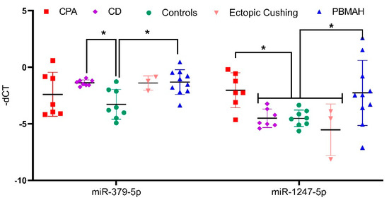 Among the analyzed miRNAs, only miR-1247-5p and miR-379-5p showed the most prominent changes in expression levels. Briefly, miR-1247-5p was significantly upregulated in ACTH-independent forms of CS, CPA, and PBMAH (Figure 1 and Figure 3) while miR-379-5p was found to be upregulated in CD and PBMAH, in comparison to controls. Even though CD and PBMAH represent CS subtypes with different ACTH dependence, albeit both with hyperplastic tissue, it is interesting to find a shared miRNA expression status. Concurrently, miRNAs have been identified as dynamic players in regulating the acute effect of ACTH on adrenal steroidogenesis in in vivo murine studies [20,21]. Further diverse miRNAs have been characterized to regulate steroidogenesis in ACTH and dexamethasone treated rats [22] (suppressed ACTH) as well as in in vitro studies [20]. It is possible that miR-379-5p contributes to the adrenal hyperplasia present in both PBMAH and CD by targeting specific genes related to hyperplasia, and miR-1247-5p by contributing to cortisol production independent of ACTH regulation in CPA and PBMAH.