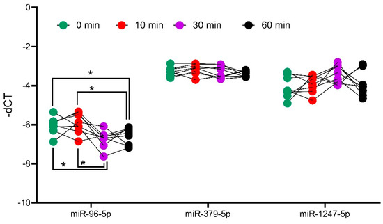 To analyze the influence of ACTH on miRNA expression, the expression of miR-1247-5p and miR-379-5p were assessed in the adrenal tissues of ACTH stimulated mice at different time points. For this analysis, miR-96-5p was taken as a positive control, as it has previously been reported to be differentially expressed in ACTH stimulated mice [17]. The analyses revealed that the expression of miR-1247-5p and miR-379-5p did not change at different timepoints of the ACTH stimulation (Figure 5). Meanwhile, the positive control of mir-96-5p showed a dynamic expression pattern with upregulation after 10 min, followed by downregulation at the subsequent 30 and 60 min time points, in concordance with previously reported findings [18].