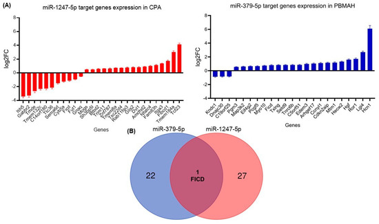 Two diverse approaches were employed for a comprehensive in silico analysis of the miRNA targets. First, the predicted targets of miR-1247-5p and miR-379-5p were taken from the TargetScan database, which identified miRNA–mRNA target pairs based on sequence analyses [19]. The expression status of these targets was then checked in the RNA sequencing data from CPA vs. controls (miR-1247-5p) and PBMAH vs. controls (miR-379-5p). Targets that showed significant expression changes in the sequencing data were shortlisted (Figure 6A). Among the 1061 predicted miR-1247-5p targets, 28 genes were found to show significant expression changes in CPA (20 upregulated, 8 downregulated). On the other hand, for 124 predicted miR-379-5p targets, 23 genes were found to show significant expression changes in PBMAH (20 upregulated, 3 downregulated). Interestingly, the selected targets were found to be unique for each miRNA, except for FICD (FIC domain protein adenylyltransferase) (Figure 6B).