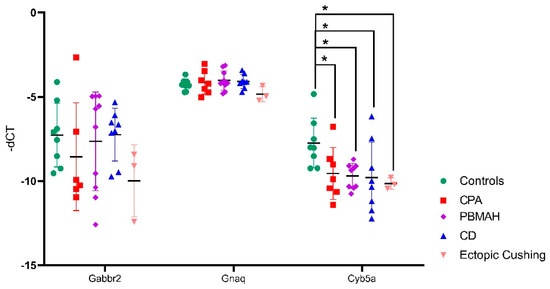 Initially, we focused on the selection of known CS specific target genes that could be directly repressed by miRNAs, thereby contributing to pathology. The predicted target genes of miR-1247-5p and miR-379-5p were assessed for their downregulated expression status in the RNA-seq data. Among the selected target genes, only Cyb5a was found to be significantly downregulated in all forms of CS (Figure 6). Cytochrome b5 (CYB5A) is a marker of the zona reticularis and is an important regulator of androstenedione production [23,24]. Based on its role in adrenal steroidogenesis, it is possible that Cyb5a is downregulated by miR1247-5p. To prove our hypothesis, a dual luciferase assay was performed in HELA cell line to identify a direct interaction between Cyb5a and miR-1247-5p (Figure 7). Unfortunately, a direct interaction could not be proven, indicating that miR-1247-5p perhaps regulates its target genes in different ways.