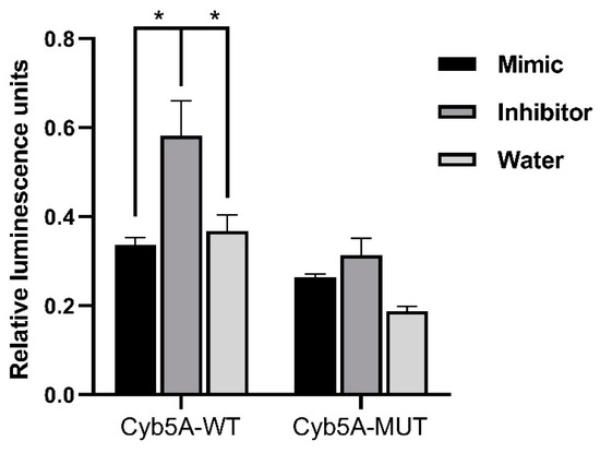Results of dual luminescence assay on cells transfected with miR-1247-5p mimics and related controls. Cells were transfected with plasmids containing either the WT or Mut miRNA binding sequence in Cyb5a. Either miR-1247-5p mimics or miR-1247-5p inhibitors were transfected together with the respective plasmids. Data are represented as mean ± standard error of mean (SEM) of relative luminescence unit values. Statistics: ANOVA test with Bonferroni correction to detect significant differences between patient groups with at least a significance of p value < 0.05 (*).