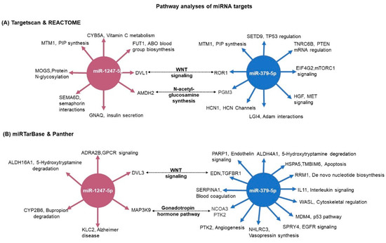 Pathway analyses of miRNA target genes. (A) The predicted targets were matched with the RNA-seq expression data. For miR-1247-5p, CPA vs. controls expression data; and for miR-379-5p, PBMAH vs. controls expression data. The significantly expressed target genes were then subjected to pathway analyses by Reactome. The significantly enriched pathway networks (p < 0.05) and their related genes are given. (B) The experimentally validated target genes from miRTarBase were analyzed for their role in pathways by the Panther database. The target genes and their related pathways are given. The commonly represented pathways are marked in bold.