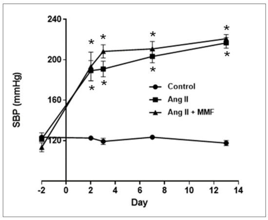 Effects of MMF on blood pressure. SBP was measured by a tail-cuff plethysmography system on day −2, 2, 3, 7 and 13. Mean ± SE. n = 6 in each group. Asterisk (p < 0.05) indicates significant difference compared to the control group at each time point.
