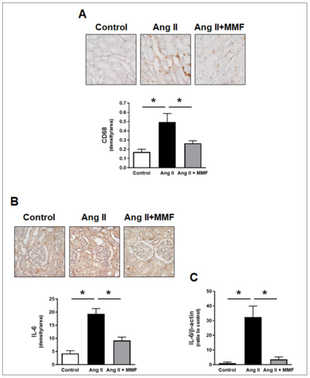Levels of intrarenal monocyte/macrophage were measured by CD68 staining. Chronic Ang II infusion increased the density of CD68 positive area in tubulointerstitium of the renal cortex (Figure 2A, 0.169 ± 0.03 in the control group vs. 0.495 ± 0.09 in Ang II-infused group, arbitrary density units, n = 6). In addition, the density of the IL-6 positive area in the renal cortex was concomitantly augmented by the chronic Ang II infusion (Figure 2B, 4.27 ± 1.03 in the control group vs. 19.3 ± 2.01 in Ang II-infused group, arbitrary density unit, n = 6). Intrarenal IL-6 mRNA levels were also markedly greater in the Ang II-infused group than in the control group (Figure 2C, 32.4 ± 7.44-fold in the Ang II-infused group, ratio to the control group, n = 6). The greater values of intrarenal monocyte/macrophage, IL-6 mRNA and protein in the Ang II-infused group were prevented by MMF treatment (Figure 2A–C).