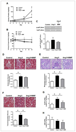 Ang II-infused rats developed proteinuria. Urinary protein levels in the group were significantly greater than in the control group by day 7 (Figure 4A, 9.0 ± 1.4 in the control group vs. 33.7 ± 5.7 in Ang II-infused group on day 7, mg/day, n = 6) and day 12 (6.7 ± 1.6 in the control group vs. 109.3 ± 24.6 in Ang II-infused group on day 12, mg/day, n = 6). MMF treatment prevented the development of proteinuria by Ang II infusion compared to the control group and the levels were significantly lower than in Ang II-infused group on day 12 (Ang II + MMF group: 46.7 ± 5.1 on day 12, mg/day, n = 6).