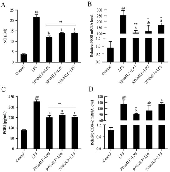 2.2. MLFs Decreased Nitric Oxide (NO) and Prostaglandin E2 (PGE2) Production in LPS-Induced RAW 264.7 Cells