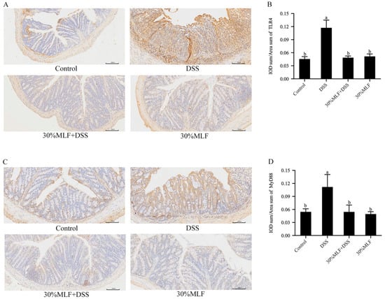 2.11. Treatment with 30%MLF Inhibited the Toll-like Receptor 4 (TLR4)/Myeloid Differentiation Factor 88 (MyD88) Pathway Activation of DSS-Induced UC in Mice