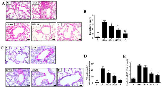 Effect of gypenoside A (GPA) on lung function. (A) Gypenoside A reduced eosinophil infiltration (HE stain, 200× magnification) (scale bar = 100 µm). (B) Pathological scores in lung tissue. (C) PAS-stained lung sections show goblet cell hyperplasia (200× magnification) (scale bar = 100 µm). (D) The number of PAS-positive cells per 100 μm of basement membrane. (E) Muc5AC expression levels in lung tissue. Three independent experiments were analyzed, and all data are presented as the mean ± SEM (n = 4–6 per group). * p < 0.05 and ** p < 0.01 compared with the OVA control group. Normal saline control group were named as N; Ovalbumin (OVA)-induced asthma mice were named as OVA. The 10 mg/kg and 30 mg/kg gypenoside A were named as GPA10 and GPA30, respectively. The 5 mg/kg prednisolone was named as P.