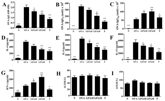 Effects of gypenoside A (GPA) on the levels of cytokines and antibodies in serum and splenocytes. Serum levels of (A) OVA-IgE, (B) OVA-IgG1, and (C) OVA-IgG2a in mice. Gypenoside A modulated the levels of (D) IL-4, (E) IL-5, (F) IL-13, and (G) IFN-γ produced by OVA-activated splenocytes. Effects of gypenoside A on serum biochemical value, including (H) ALT and (I) AST. The data are presented as the mean ± SEM of three independent experiments (n = 8 per group). * p < 0.05, ** p < 0.01 compared with the OVA control group. Normal saline control group were named as N; Ovalbumin (OVA)-induced asthma mice were named as OVA. The 10 mg/kg and 30 mg/kg gypenoside A were named as GPA10 and GPA30, respectively. The 5 mg/kg prednisolone was named as P.