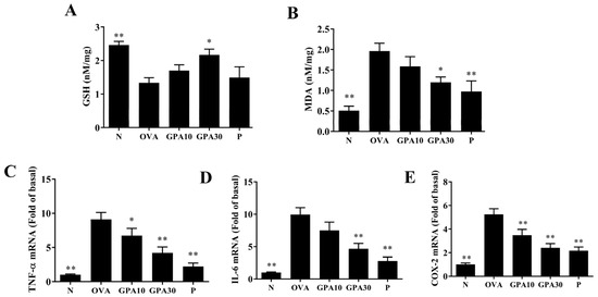 Effects of gypenoside A (GPA) on oxidative stress and inflammation in lung tissue. (A) GSH activity, and (B) MDA activity for oxidative stress. (C) TNF-α, (D) IL-6, and (E) COX-2 gene expression promoting inflammation in lung tissue. The data are presented as the mean ± SEM of three independent experiments (n = 8 per group). * p < 0.05, ** p < 0.01 compared with the OVA control group. Normal saline control group were named as N; Ovalbumin (OVA)-induced asthma mice were named as OVA. The 10 mg/kg and 30 mg/kg gypenoside A were named as GPA10 and GPA30, respectively. The 5 mg/kg prednisolone was named as P.
