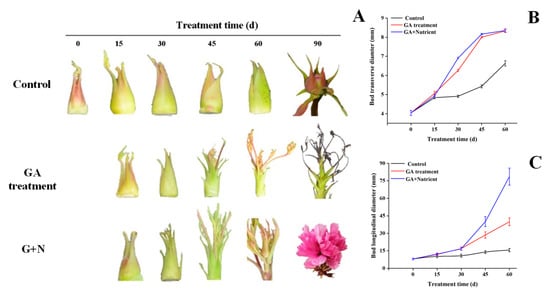 Effects of different treatments on the appearance and morphology of tree peony ‘Qiu Fa No. 1’ flower buds. (A) Morphological changes. (B,C) Variation trend of flower bud’s horizontal and longitudinal diameter. Error bars indicate the SD (n = 10).
