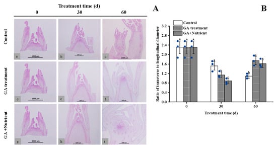 We then observed the internal microstructure of buds through paraffin sections. The results showed that in the control group, the buds underwent continuous growth and development from 0 to 60 d, from undifferentiated to the bract primordium stage. After GA treatment, the bud growth accelerated, and reached the sepal primordial stage at 60 d. The G + N treatment also promoted bud differentiation, the buds developed into pistil primordial stage at 60 d, and the entire bud differentiation was completed (Figure 2A). We also statistically analyzed the ratio of the transverse to the longitudinal diameter of the buds. In the control group, this ratio decreased consistently, from 2.3 at 0 d to 1.1 at 60 d; in both the GA and G + N groups, this decrease was significantly slower by 60 d, with average ratios of 1.8 and 1.6, respectively (Figure 2B).