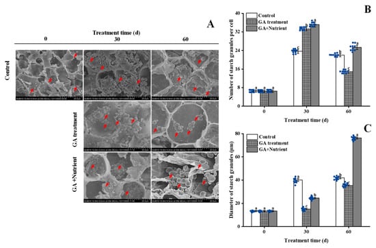 In our previous study, we found that under the forcing culture conditions in autumn, flower buds need to continuously consume starch stored in cells during the dormancy release process []. In the present study, the starch granule number significantly increased in all three groups at 30 d, with the higher numbers in the GA and G + N treatment groups; after that, the starch granule number in both the GA and G + N treatment groups decreased at 60 d, especially in the GA treatment group, whereas in the G + N group, this number was still greater than that in the control group (Figure 3A,B). The size of the starch granules increased 3.1 times in the control group at 30 d and remained constant at 60 d; this increase was delayed in both the GA and G + N treatment groups, and in the G + N group, the starch granule diameter sharply increased to 76.3 μm, which far exceeded that of the other two groups (Figure 3C).