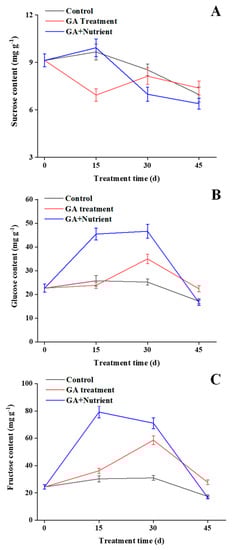 The sucrose content in the control group increased at 15 d, and then declined after that; in the GA treatment group, its level decreased at 15 d, and then slight recovered; the G + N group showed a similar trend to that of the control group, with the lower level at 30 d (Figure 4A). The glucose and fructose content showed a similar trend: in the control group, their content remained relatively stable in the first 45 d, and had a slight drop after that; GA treatment dramatically induced their content at 30 d, whereas in the G + N group, this inducing advanced their content to 15 d, with a higher level (Figure 4B,C).