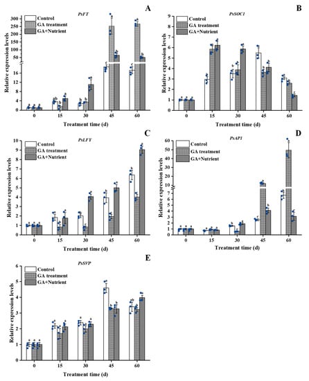 Effect of GA treatment and GA + Nutrient treatment on the expression of (A) PsFT, (B) PsSOC1, (C) PsLFY, (D) PsAP1, and (E) PsSVP in the buds of tree peony ‘Qiu Fa No. 1’. Error bars indicate the SD (n = 3). Different lowercase letters indicate significant differences (Tukey’s test, α = 0.05), and the blue dots indicate the actual data.