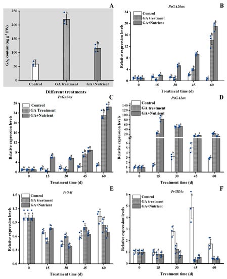 Effect of GA treatment and GA + Nutrient treatment on the (A) GA3 content (in the shaded area) and expression of (B) PsGA20ox, (C) PsGA3ox, (D) PsGA2ox, (E) PsGAI, and (F) PsGID1c in the buds of tree peony ‘Qiu Fa No. 1’. Error bars indicate the SD (n = 3). Different lowercase letters indicate significant differences (Tukey’s test, α = 0.05), and the blue dots indicate the actual data.
