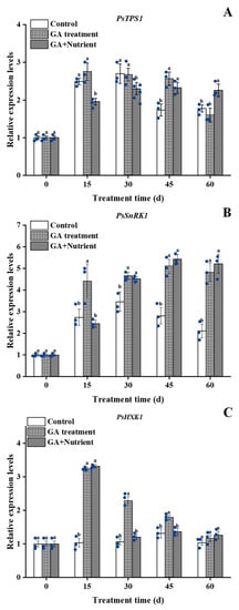 Sugar has been confirmed as a new signal substance in recent years. In this study, we also determined the expression of three signal pathway-related genes. The results showed that the expression of PsTPS1 increased in all three groups from 15 d; this increase began to decline at 45 d and 60 d in the control and GA treatment groups, respectively, whereas no decline occurred in the G + N group (Figure 7A). The expression of PsSnRK1 showed a single-peak curve, and the GA and G + N treatments increased its expression from 15 d and 30 d, respectively (Figure 7B). The expression of PsHXK1 was stable in the control group, whereas both the GA and G + N treatments significantly increased its expression with similar levels at 15 d, and in the G + N group, its expression rapidly declined after that (Figure 7C).
