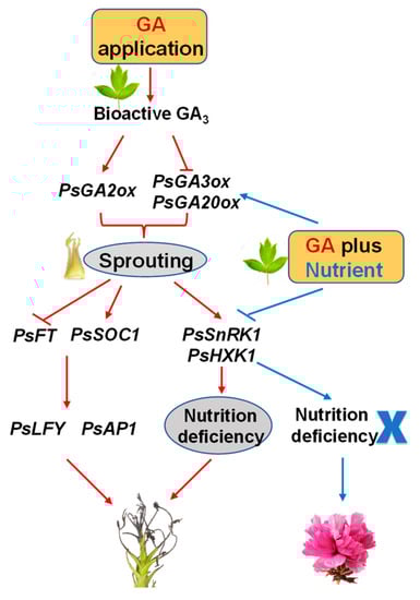 Studies have shown that HXK1, as a sugar transport signal, can inhibit plant growth. In transgenic tomato, overexpression of AtHXK1 significantly inhibits plant growth and development and causes plant senescence and delays flowering []. In tree peony, the expression of PsHXK1 is inhibited by defoliation and GA treatment and induced flowering during the progression of spring festival forcing culture []. In this study, PsHXK1 responded rapidly to the exogenous GA, and then it maintained at a relative higher level up to 45 d, which further confirmed the nutrient deficiency after GA treatment. In short, a sufficient nutrient supply is necessary to further trigger tree peony reflowering at an earlier date in autumn under current forcing culture technologies (Figure 8).