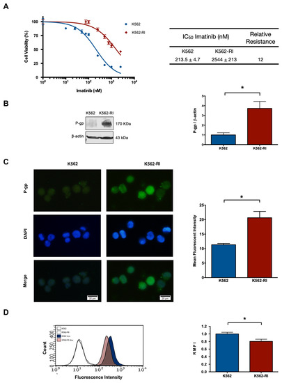 The next step was to examine differences between the two cell lines in relation to certain parameters. In a recent clinical study on CML patients by Ammar et al. (2020), an association was found between elevated levels of P-gp and unresponsiveness to treatment, indicating that the overexpression of P-gp is probably a relevant mechanism in the development of resistance to imatinib [32]. According to the present data from Western blot analysis and immunofluorescence assays, P-gp levels were almost undetectable in the parent cells but were about 4-fold higher in K562-RI cells.
