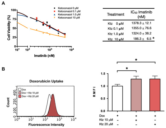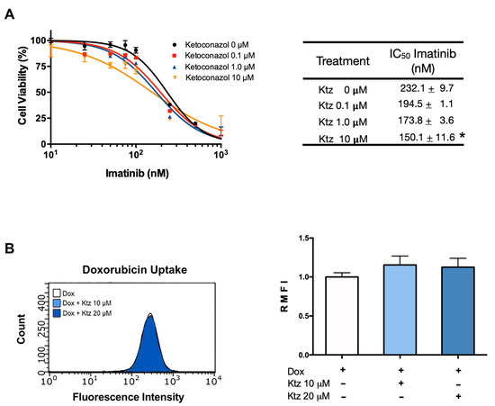 Effect of ketoconazole on K562 cells (sensitive to imatinib). (A) Cell viability of the K562 cell line exposed to imatinib in the absence or presence of ketoconazole (at 0.1, 1.0, and 10 μM). The table shows the IC50 of imatinib alone and imatinib plus ketoconazole. (B) Effect of ketoconazole (at 10 and 20 μM) on the fluorescence of doxorubicin in K562 cells, representative histograms with raw data and in a bar graph. Data are expressed as the relative mean fluorescence intensity (RMFI) ± SEM of three independent experiments. The cells treated with doxorubicin plus ketoconazole 10 and 20 µM were normalized against doxorubicin alone. Ktz, ketoconazole; Dox, doxorubicin. * Significant difference (p < 0.05) by one-way analysis of variance (ANOVA) followed by Tukey’s test.