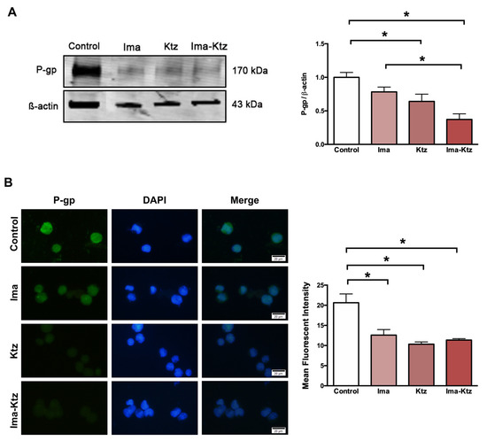 P-gp expression in resistant cells treated with imatinib and ketoconazole. (A) P-gp expression levels in K562-RI cells exposed to imatinib in the absence and presence of ketoconazole based on Western blot and its densitometric analysis (β-actin was the load control); three Western blots from three independent experiments were used for densitometric analysis ± SEM. (B) analysis of P-gp evaluated by the immunofluorescence assay (DAPI was used to visualize the nuclei). The Mean Fluorescent Intensity was quantified by counting P-gp-positive cells (in 40–45 cells per group counted randomly) from three independent experiments. The cells K562-RI cells were exposed to imatinib alone (200 nM), ketoconazole alone (10 μM), or imatinib plus ketoconazole (200 nM/10 μM). * p < 0.05; determined with ANOVA followed by Tukey’s test. Scale bars: 20 μm. Ima, imatinib; Ktz, ketoconazole.