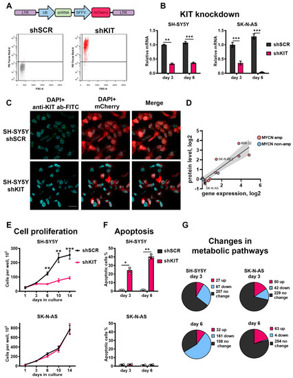 (A) Transduction of SH-SY5Y cells with lentiviral vectors encoding control shRNA (shSCR) and shRNA against KIT (shKIT). Transduction efficacy was measured three days after transduction by flow cytometry, based on fluorescence intensity of mCherry protein (PE-Texas Red-A). (B) Relative mRNA KIT levels measured by real-time PCR three and six days after lentiviral shRNA transduction. KIT gene expression for each sample was normalized to GAPDH expression. (C) Immunocytochemistry analysis for KIT protein in SH-SY5Y cells 3 days after transduction with shSCR or shKIT lentiviral vectors. Nuclei were stained with DAPI. Larger images are available on Figure S3. (D) Correlation between KIT mRNA and protein levels for NB cells according to CCLE gene expression and protein array data. (E) Number of viable cells measured for 14 days after transduction with shRNAs. (F) Percentage of apoptotic cells measured three and six days after transduction by flow cytometry using annexin-V and SYTOX-blue staining. (G) Number of upregulated and downregulated metabolic pathways after transduction of SH-SY5Y and SK-N-AS cells. * p < 0.05, ** p < 0.01, *** p < 0.001 as determined by two-tailed t-test for PCR experiments, and by Mann–Whitney test for other experiments.