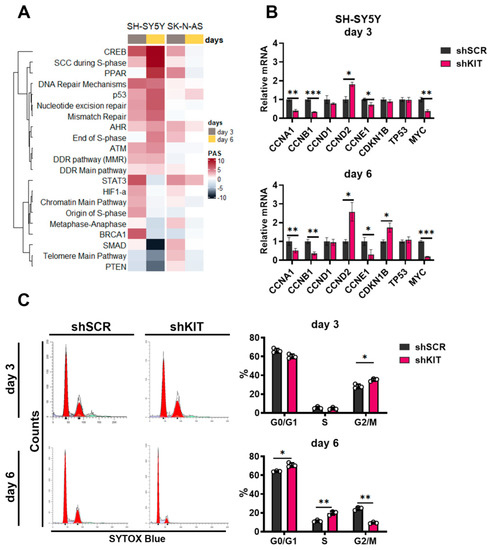 We further verified changes in cell cycle transition using SYTOX DNA staining and flow cytometry (Figure 3C). On day 3, we observed an increased percentage of SH-SY5Y cells in G2/M phase (35% for shKIT vs. 28% for shSCR). Since we observed inhibited proliferation and increased apoptotic rate (Figure 2B,C), thus suggesting that the cells that entered G2 phase by day 3 could not progress cell cycle further and entered mitosis. At day 6, the proportion of G2/M SH-SY5Y shKIT cells dropped dramatically (9% for shKIT vs. 24% for shSCR) while the proportion of cells in the S-phase increased (20% for shKIT vs. 11% for shSCR). Overall these changes in cell cycle progression were consistent with the activation of signaling pathways related to S-phase transition (Figure 3A) and downregulation of CCNA1 and CCNB1 expression (Figure 3B).