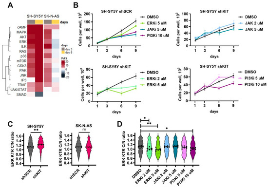 (A) Pathway activation strength for pathways related to intracellular kinase activity. Pathways were clustered using Ward’s clustering method. (B) Number of viable cells transduced with shSCR or shKIT in the presence of ERK1/2 inhibitor FR180204 (ERKi), JAK2 inhibitior AG490 (JAKi), or PI3K inhibitor wortmannin (PI3Ki). Drugs were added on day 3, then growth medium was changed on day 6, and drugs were added in the same concentrations. (C) ERK activity distribution in SH-SY5Y and SK-N-AS cells three days after transduction with shSCR or shKIT vectors. ERK activity was determined by calculation of cytoplasm to nuclei (C/N) ration for ERK-KTR reporter. Dots represent median C/N ratios for each of six biological repeats. Each repeat contains data for 400-700 cells. Violin plots show C/N ratio distribution for all analyzed cells. (D) ERK activity distribution for SH-SY5Y cells treated with kinase inhibitors for 24 h. * p < 0.05, ** p < 0.01 as determined by Mann–Whitney test.