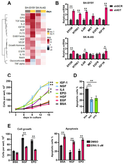 (A) Pathway activation strength for pathways related to growth factor signaling. Pathways were clustered using Ward’s clustering method. (B) Relative mRNA levels for growth factor receptor genes measured by real-time PCR six days after lentiviral shRNA transduction of SH-SY5Y and SK-N-AS cells. Each gene expression for each sample was normalized to GAPDH expression. (C) Number of viable cells measured for 15 days after SH-SY5Y transduction with KIT-specific shRNAs in the presence of recombinant growth factors. Recombinant growth factors (100 ng/mL) were added on day 3 after lentiviral transduction, then on day 6, growth medium was changed and growth factors were added in the same concentrations, and this process was repeated on days 9 and 12. Bovine serum albumin (BSA) was used as a control mock treatment, as it was used for protein stabilization. (D) Percentage of apoptotic cells measured six days after transduction. EPO and NGF (100 ng/mL) were added on the third day after transduction. Apoptosis was measured by flow cytometry using annexin-V and SYTOX-blue staining. (E) Number of viable cells and percentage of apoptotic cells six days after SH-SY5Y transduction with shKIT lenviral vector in the presence of EPO and NGF and ERK1/2 inhibitor FR180204 (ERKi). EPO and NGF (100 ng/mL) and FR180204 (5 μM) were added on the third day after transduction. * p < 0.05, ** p < 0.01 as determined by two-tailed t-test for PCR experiments, and by Mann–Whitney test for other experiments.