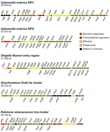 Figure 1. Clusters of genes that encode T3SSs. SPI1 and SPI2 from S. enterica serovar Typhimurium, the entry region from S. flexneri, the tts cluster from S. fredii, and the hrp cluster from R. solanacearum.