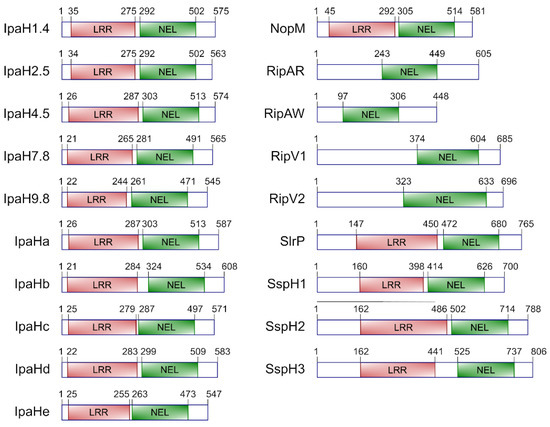 Figure 2. Diagram of domain structure of effectors of the NEL family of E3 ubiquitin ligases: IpaH proteins from S. flexneri; NopM from S. fredii; RipAR, RipAW, RipV1, and RipV2 from R. solanacearum; SlrP, SspH1, SspH2, and SspH3 from S. enterica. Boundaries for each domain are numbered according to the InterProScan predictions [99].