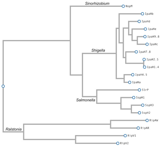 There are more than 500 experimentally validated T3S effectors, and over 8000 were identified as candidate effectors by sequence similarity search [4]. Effectors are extremely diverse, although they share some common structural features [5]. They contribute to the manipulation of the host using a variety of eukaryotic targets located in different cellular compartments [6]. These proteins exhibit a modular structure with several domains or motifs [7]. The secretion domain is usually located in the first 25 N-terminal residues, and some effectors have a chaperone binding domain between residues 50 and 150 [8], although specific secretion through the injectisome may also depend in some cases on the C-terminal region [9,10,11,12]. Functional domains are typically localized to the central and C-terminal portions, and many effectors are chimeras of other known effectors, or an effector and another protein [13]. Effectors may contain domains or motifs involved in subcellular targeting, including mitochondrial targeting sequences, membrane-targeting motifs, and nuclear localization sequences, and in protein–protein interaction. Among the host processes that are manipulated by the activity of effector domains are caspase activation, actin nucleation, microtubule polymerization, regulation of G proteins, AMPylation, ADP-ribosylation, cAMP synthesis, proteolysis, lipid degradation, phosphorylation, and ubiquitination [7]. This review focuses on a family of bacterial E3 ubiquitin ligase effectors whose secretion and activity have been studied in Salmonella, Shigella, Sinorhizobium (Ensifer), and Ralstonia.