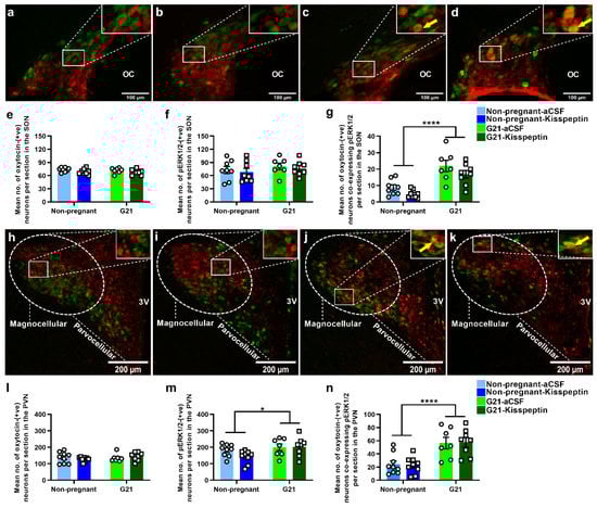 We labelled for pERK1/2 and oxytocin in the SON and PVN of non-pregnant and gestation day 21 (G21, the expected day of parturition) rats, and example photomicrographs are shown in Figure 1a–d,h–k. Although there was a higher proportion of oxytocin-positive neurons co-expressing pERK1/2 in the SON of aCSF-treated (32.56 ± 4.18%, n = 7) and kisspeptin-treated (25.62 ± 3.19%, n = 8) G21 rats than in aCSF-treated (11.44 ± 4.18%, n = 8) and kisspeptin-treated (7.40 ± 1.13%, n = 8) non-pregnant rats, there was no effect of ICV kisspeptin on the proportion of oxytocin-positive neurons co-expressing pERK1/2 in the SON of non-pregnant and G21 rats (Reproductive status (RS): F(1,1) = 33.17, p ˂ 0.0001; Treatment (T): F(1,1) = 4.20, p = 0.050; RS × T: F(1,2) = 0.050, p = 0.824, two-way ANOVA; Figure 1e–g).