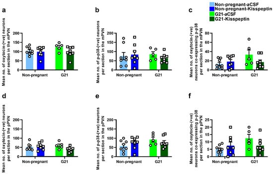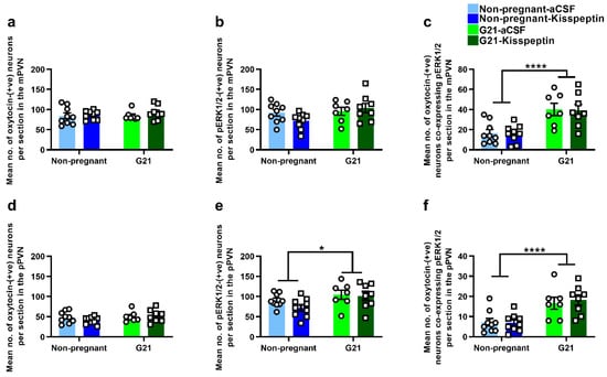 Subdividing the PVN into the magnocellular PVN (mPVN) and parvocellular PVN (pPVN) revealed similar results for both regions as was found for the PVN as whole. There was higher proportion of oxytocin-positive neurons co-expressing pERK1/2 in the mPVN of aCSF-treated (46.93 ± 6.71%, n = 7) and kisspeptin-treated (43.14 ± 4.95%, n = 8) G21 rats than in the aCSF-treated (22.04 ± 5.37%, n = 9) and kisspeptin-treated (19.10 ± 3.12%, n = 9) non-pregnant rats, but there was no effect of ICV kisspeptin on the proportion of oxytocin-positive neurons co-expressing pERK1/2 in the mPVN (RS: F(1,1) = 26.27, p < 0.0001; T: F(1,1) = 0.028, p = 0.866; RS × T: F(1,2) = 0.0006, p = 0.980; Figure 2a–c) of non-pregnant and G21 rats. Similarly, there was higher proportion of oxytocin-positive neurons co-expressing pERK1/2 in the pPVN of aCSF-treated (37.09 ± 4.99%, n = 7) and kisspeptin-treated (37.37 ± 4.75%, n = 8) G21 rats than in aCSF-treated (17.68 ± 4.04%, n = 9) and kisspeptin-treated (18.24 ± 3.81%, n = 9) non-pregnant rats, but there was no effect of ICV kisspeptin on the proportion of oxytocin-positive neurons co-expressing pERK1/2 in the pPVN (RS: F(1,1) = 23.15, p < 0.0001; T: F(1,1) = 0.076, p = 0.783; RS × T: F(1,2) = 0.186, p = 0.669; Figure 2d–f) of non-pregnant and G21 rats.