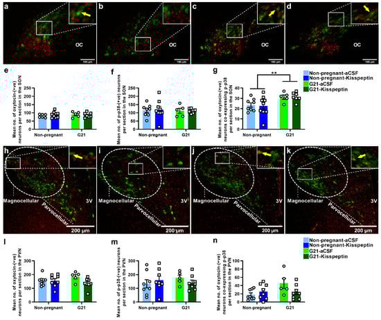 We labelled for p-p38 and oxytocin in the SON and PVN of non-pregnant and G21 rats, and example photomicrographs are shown in Figure 3a–d,h–k. Similarly to pERK1/2, there was a higher proportion of oxytocin-positive neurons co-expressing p-p38 in the SON of aCSF-treated (34.96 ± 2.64%, n = 5) and kisspeptin-treated (37.62 ± 3.01%, n = 7) G21 rats than in aCSF-treated (28.79 ± 3.04%, n = 8) and kisspeptin-treated (26.21 ± 3.58%, n = 9) non-pregnant rats, but there was no effect of ICV kisspeptin on the proportion of oxytocin-positive neurons co-expressing p-p38 in the SON of non-pregnant or G21 rats (RS: F(1,1) = 9.90, p = 0.004; T: F(1,1) = 0.007, p = 0.930; RS × T: F(1,2) = 0.052, p = 0.821, two-way ANOVA; Figure 3e–g). By contrast to the SON, there was no effect of reproductive status or ICV kisspeptin on p-p38 expression in oxytocin neurons in the PVN as a whole (RS: F(1,1) = 3.39, p = 0.077; T: F(1,1) = 0.939, p = 0.341; RS × T: F(1,2) = 4.23, p = 0.050; Figure 3l–n) or in the mPVN (RS: F(1,1) = 2.90, p = 0.100; T: F(1,1) = 0.99, p = 0.32; RS × T: F(1,2) = 3.55, p = 0.071; Figure 4a–c) or pPVN (RS: F(1,1) = 3.35, p = 0.078; T: F(1,1) = 0.353, p = 0.557; RS × T: F(1,2) = 3.35, p = 0.078; Figure 4d–f) of non-pregnant (aCSF-treated, n = 8, kisspeptin-treated, n = 8) and G21 rats (aCSF-treated, n = 5, kisspeptin-treated, n = 8).
