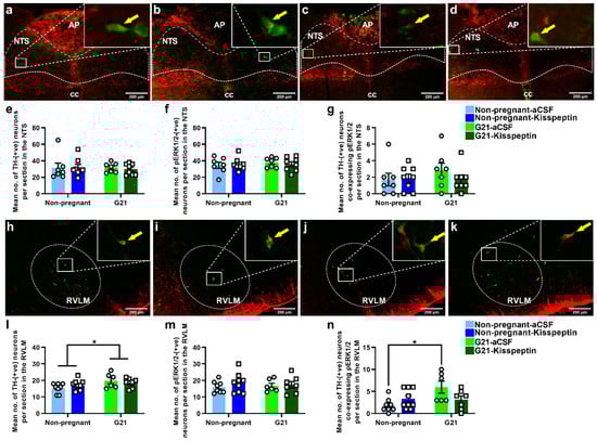 Examples of pERK1/2 and TH labelling in the NTS and RVLM of non-pregnant and G21 rats are shown in Figure 5a–d,h–k. There was no effect of reproductive status or ICV kisspeptin on the number of TH-positive neurons co-expressing pERK1/2 in the NTS (RS: F(1,1) = 0.580, p = 0.453; T: F(1,1) = 0.501, p = 0.485; RS × T (F(1,2) = 0.900, p = 0.351, two-way ANOVA; Figure 5e–g) of non-pregnant (aCSF-treated, n = 7, kisspeptin-treated, n = 8) and G21 rats (aCSF-treated, n = 7, kisspeptin-treated, n = 8). Irrespective of kisspeptin treatment, pERK1/2 expression in TH-positive NTS neurons correlated with pERK1/2 expression in oxytocin-positive SON neurons (r = 0.536, p = 0.039), but there was no correlation between pERK1/2 expression in TH-positive NTS neurons and oxytocin-positive PVN neurons (r = 0.098, p = 0.726) or mPVN neurons (r = 0.221, p = 0.428) or pPVN neurons (r = −0.192, p = 0.492) in G21 rats.