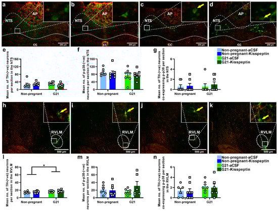 Examples of p-p38 and TH labelling in the NTS and RVLM of non-pregnant and G21 rats are shown in Figure 6a–d,h–k. Similarly to pERK1/2, there was no effect of reproductive status or ICV kisspeptin on the number of TH-positive neurons co-expressing p-p38 in the NTS (RS: F(1,1) = 0.086, p = 0.771; T: F(1,1) = 0.344, p = 0.562; RS × T: F(1,2) = 0.086, p = 0.771; Figure 6e–g) of non-pregnant (aCSF-treated, n = 7, kisspeptin-treated, n = 7) and G21 rats (aCSF-treated, n = 7, kisspeptin-treated, n = 8). Additionally, there was no correlation between p-p38 expression in TH-positive NTS neurons and oxytocin-positive SON neurons (r = −0.287, p = 0.392), PVN neurons (r = 0.181, p = 0.572), mPVN neurons (r = 0.169, p = 0.598) or pPVN neurons (r = 0.198, p = 0.536) in G21 rats. By contrast to pERK1/2 expression in TH-positive RVLM neurons, there was no effect of reproductive status or ICV kisspeptin on p-p38 expression in TH-positive RVLM neurons (RS: F(1,1) = 1.44, p = 0.241; T: F(1,1) = 0.005, p = 0.944; RS × T: F(1,2) = 0.005, p = 0.944; Figure 6l–n) of non-pregnant (aCSF-treated, n = 6, kisspeptin-treated, n = 8) and G21 rats (aCSF-treated, n = 6, kisspeptin-treated, n = 6). Additionally, there was no correlation between p-p38 expression in TH-positive RVLM neurons and oxytocin-positive SON neurons (r = −0.199, p = 0.607) in G21 rats.