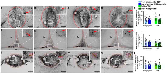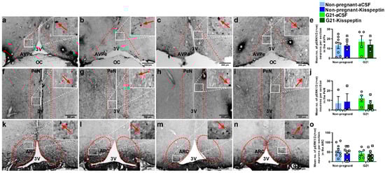 Examples of pERK1/2 labelling in the AVPe, PeN and ARC of non-pregnant and G21 rats are shown in Figure 9a–d,f–i,k–n. There was no effect of reproductive status or ICV kisspeptin on the number of pERK1/2-positive AVPe neurons in non-pregnant (aCSF-treated, n = 8, kisspeptin-treated, n = 5) and G21 rats (aCSF-treated, n = 4, kisspeptin-treated, n = 3) (RS: F(1,1) = 0.270, p = 0.609; T: F(1,1) = 0.126, p = 0.726; RS × T: F(1,2) = 0.090, p = 0.767, two-way ANOVA; Figure 9e), PeN neurons in non-pregnant (aCSF-treated, n = 3, kisspeptin-treated, n = 3) and G21 rats (aCSF-treated, n = 4, kisspeptin-treated, n = 4) (RS: F(1,1) = 0.046, p = 0.834; T: F(1,1) = 0.159, p = 0.698; RS × T: F(1,2) = 0.498, p = 0.496; Figure 9j) or ARC neurons in non-pregnant (aCSF-treated, n = 9, kisspeptin-treated, n = 9) and G21 rats (aCSF-treated, n = 6, kisspeptin-treated, n = 8) (RS: F(1,1) = 0.764, p = 0.389; T: F(1,1) = 0.719, p = 0.403; RS × T: F(1,2) = 0.358, p = 0.554; Figure 9o). Also, there was no correlation between pERK1/2 expression in oxytocin-positive SON neurons and pERK1/2-positive AVPe neurons (r = 0.069, p = 0.882), PeN neurons (r = −0.143, p = 0.735) or ARC neurons (r = −0.074, p = 0.809) in G21 rats.